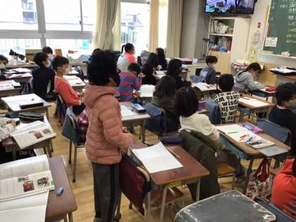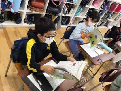 社会科の時間です。消防署の人たちは、どのような仕事をしているかを調べています。子どもたちは、問題意識が高く意欲的に学んでいます。