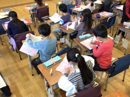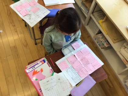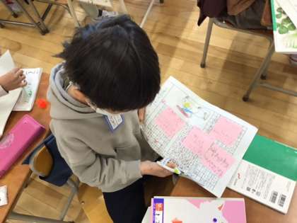 国語の時間です。友達が付箋にたくさんアドバイスを書いてくれました。