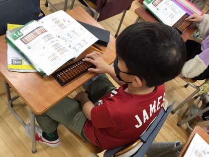 算数の時間です。「そろばん」の学習です。どんな仕組みだったかを復習しています。