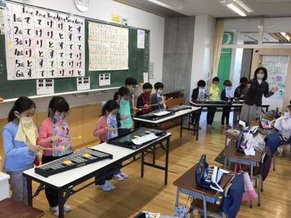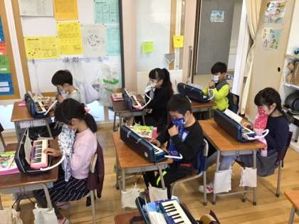 音楽の時間です。たくさんの楽器に挑戦して、「きらきらぼし」の合奏をしています。すてきな合奏ですね。