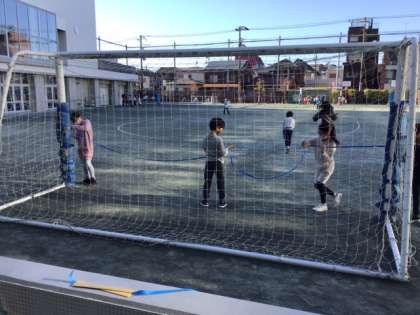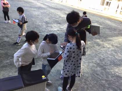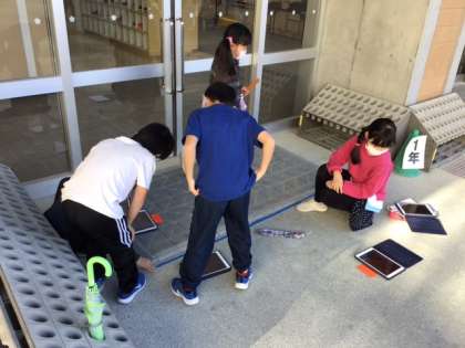 算数の時間です。「長いものの長さ」テープを使って、いろいろのものの長さをはかり、iPadに記録しています。j