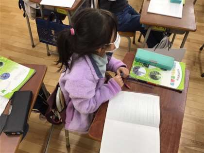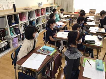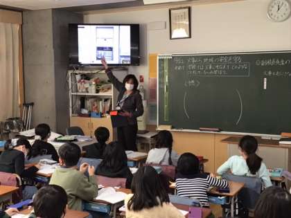社会科の時間です。今日のゲストティーチャーは、副校長先生です。学校ではどのように安全を守っているのか教えていただきました。