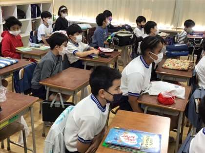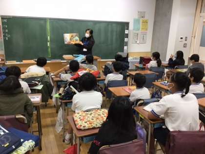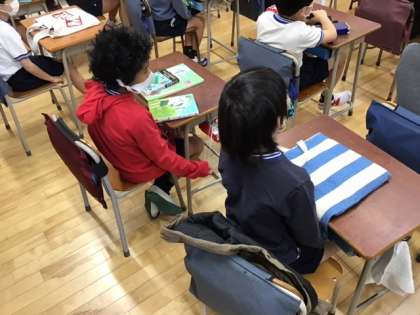 国語の時間です。司書の先生が、「おみくじ」という本を読み聞かせてくれました。