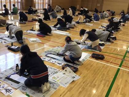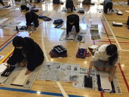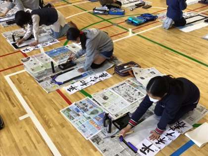 今日は、席書会です。6年生の題字は、「平和な春」。心を整えて、気持ちを込めて書いています。