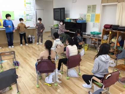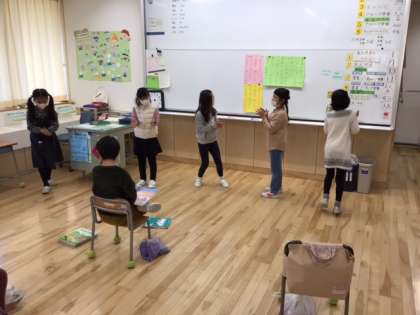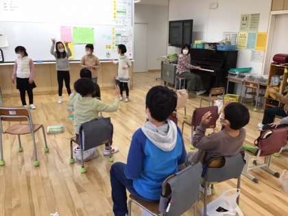 音楽の時間です。歌詞に合った振り付けで、みんなで歌とダンスを楽しんでいます。