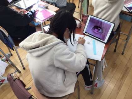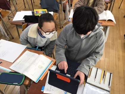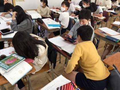 国語の時間です。お気に入りの詩を選び、選んだ詩の魅力や良いところを伝え合っています。