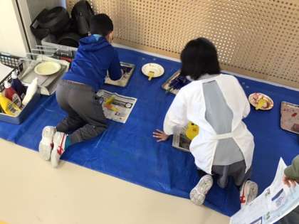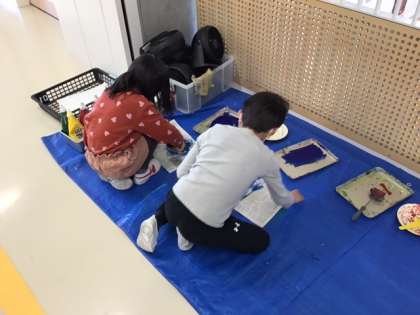 図工の時間です。形を切ったり、ちぎったり、材料をはったりして版を作ったあと、インクをつけて版画の完成です。