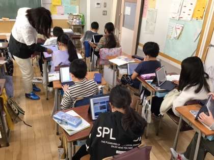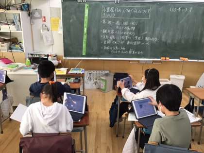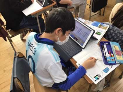 社会科の時間です。小笠原村の人々の暮らしについて、調べたことをまとめています。