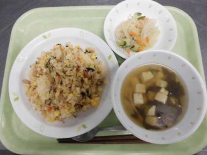 献立 ビビンバチャーハン、はりはりサラダ、わかめスープ、牛乳
