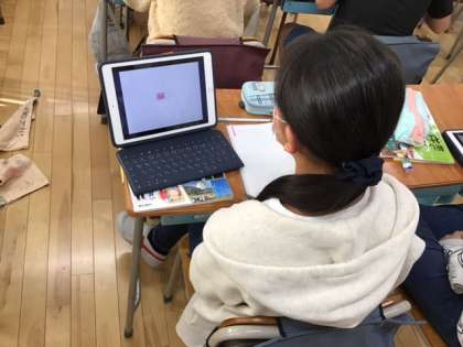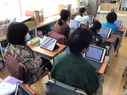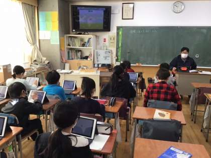 社会科の時間です。インターネットの利用で起こる問題点について、ロイロノートで意見を交流しています。