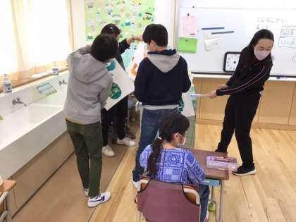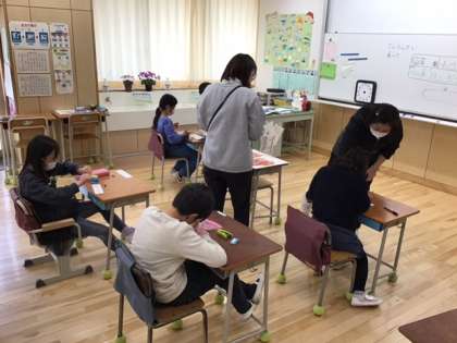 図工の時間です。展覧会に向けて、作品選びと名札づくりを進めています。
