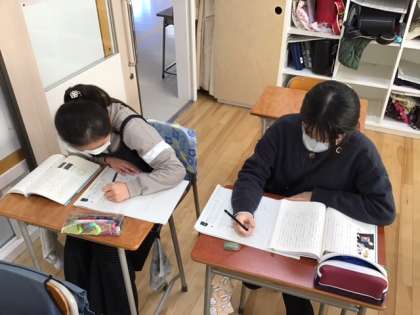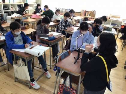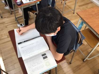 国語の時間です。「想像力のスイッチを入れよう」自分の経験から、メディアとの関わり方について、自分の考えをワークシートにまとめていきます。