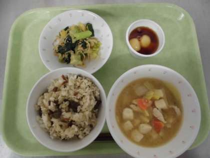 献立 深川飯、小松菜ともやしのごまじょうゆ和え、みそちゃんこ汁、みたらしだんご、牛乳