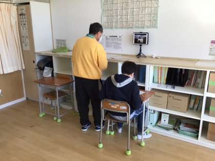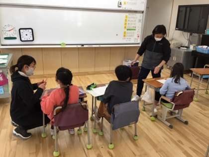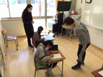 グループ学習の時間です。質問をしたり、話し合ったりしながら、学習を進めています。