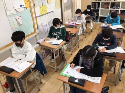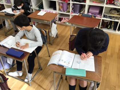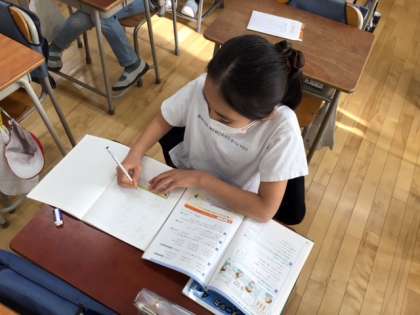 算数の時間です。小数と整数のかけ算、わり算のまとめに、集中して取り組んでいます。