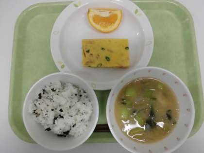 献立 わかめご飯、千種焼き、野菜のみそ汁、いよかん、牛乳