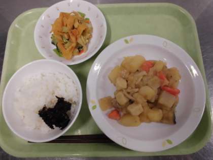 献立 ご飯、のりの佃煮、鶏じゃが、パリパリサラダ、牛乳