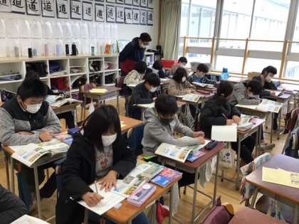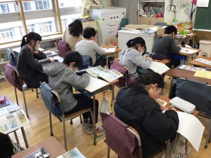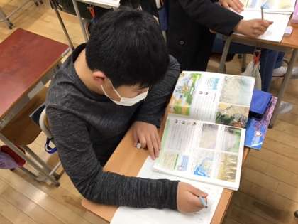 社会科の時間です。「風水害はどのような場所で発生するのか」を、今までの学習も思い起こしながら考えています。