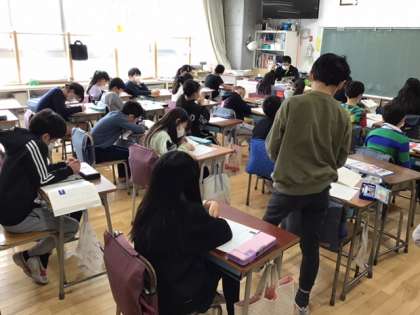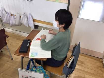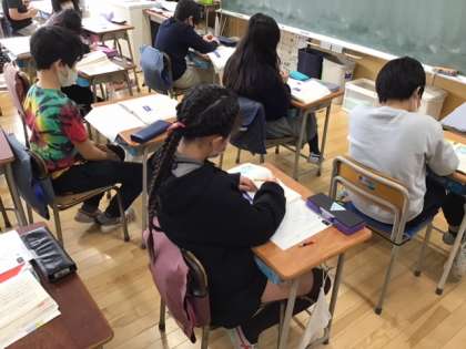 国語の時間です。「うなぎのなぞを追って」段落ごとに、予想したこと、調査したこと、結果を読み取り、小見出しをつけます。