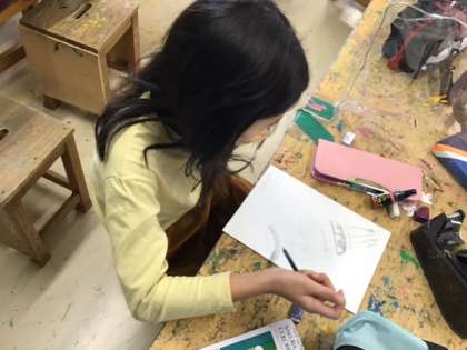 図工の時間です。「ものをよく見て スケッチしよう」本物をよく観察して、写真みたいに描いていきます。