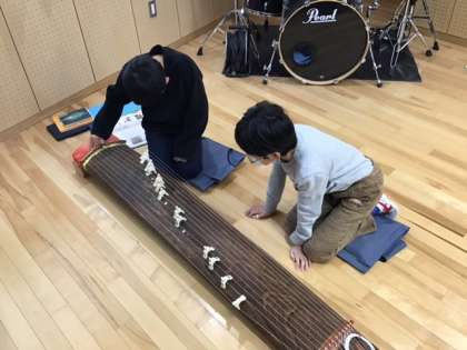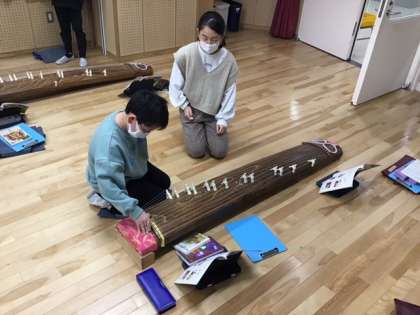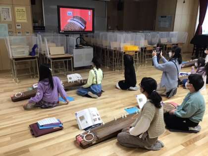 音楽の時間です。初めて「琴」に挑戦しています。座り方、爪のはめ方、手のかまえ方など、ますは基本からですね。