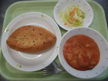 献立 ガーリックトースト、ハンガリー風シチュー、キャベツサラダ、牛乳
