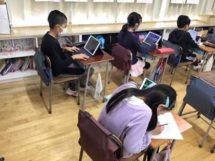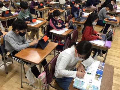 社会科の時間です。世界遺産の中にある「小笠原村」について、新聞形式でまとめています。