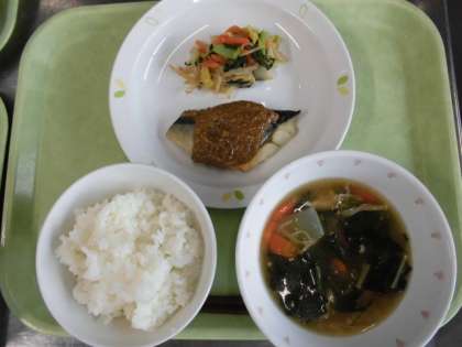 献立 ご飯、さばのごまだれかけ、わさび和え、みぞれ汁、牛乳