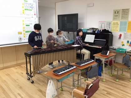 グループ学習の時間です。高学年のみなさんは、木琴の演奏に取り組んでいます。リズムを合わせるところがむずかしいですね。