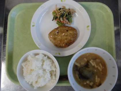 献立 ご飯、れんこんのつくね焼き、ごま酢和え、高野豆腐のみそ汁、牛乳
