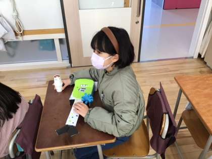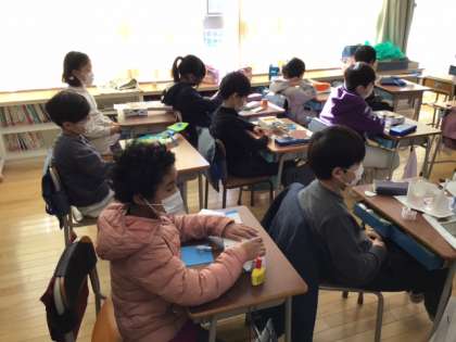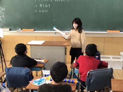 図工の時間です。「みんなで オンステージ! 発表会」工夫したことやがんばったことなどを発表しています。;