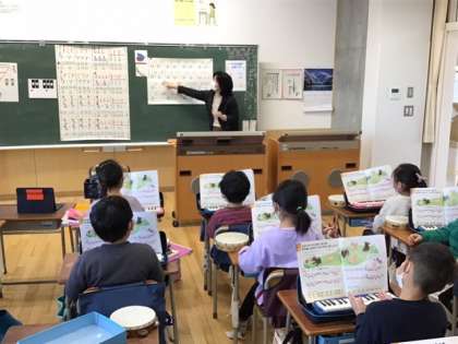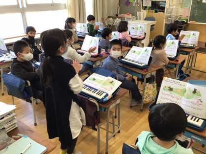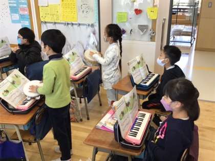 音楽の時間です。「こいぬの マーチ」の合奏に挑戦しています。気持ちを合わせることが大切ですね。