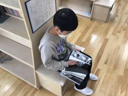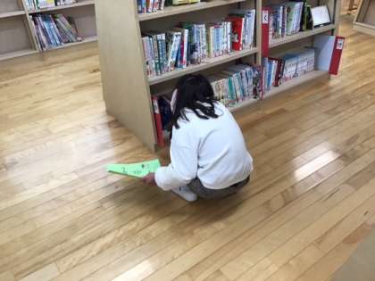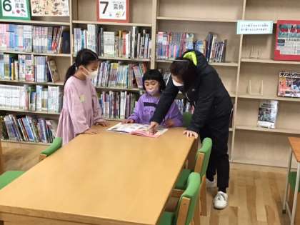 読書の時間です。木曜日の1時間目は、大好きな図書館での読書の時間です。「この本、面白いよ!」