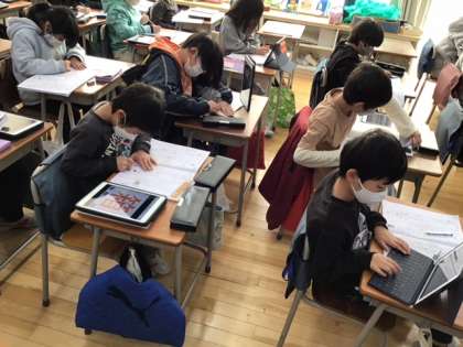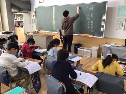 国語の時間です。漢字の学習に取り組んでいます。「箱」「湯」を使った熟語も考えています。