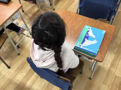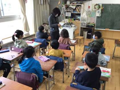算数の時間です。「かたちづくり」の学習をします。きちんとしたあいさつで授業がスタートします。