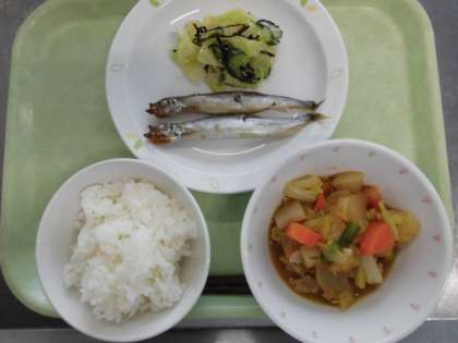 献立 ご飯、ししゃもの香味焼き、豚肉と大根のうま煮、塩昆布和え、牛乳