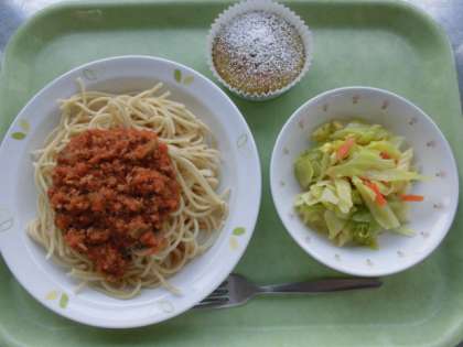 献立 スパゲッティミートソース、キャベツとコーンのサラダ、小松菜とチーズのケーキ、牛乳