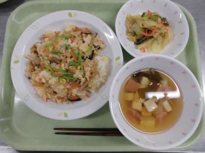 献立 ちらしずし、みそドレッシングサラダ、豆腐とわかめのすまし汁、牛乳
