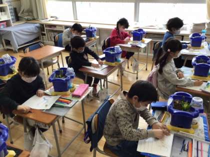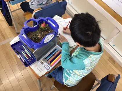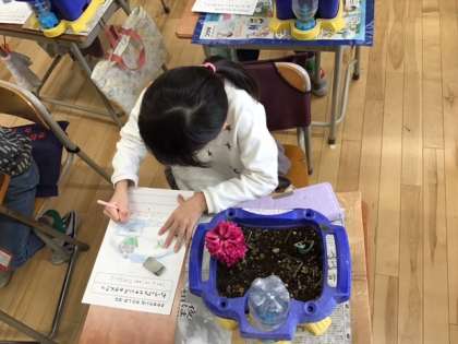 生活科の時間です。「さかせたいな わたしの はな」チューリップとヒヤシンスの観察をしています。