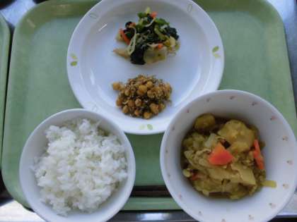 献立 ご飯、カレー肉じゃが、大豆とじゃこの甘辛あげ、ほうれん草のだしじょうゆ和え、牛乳