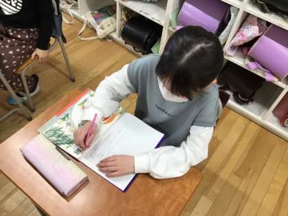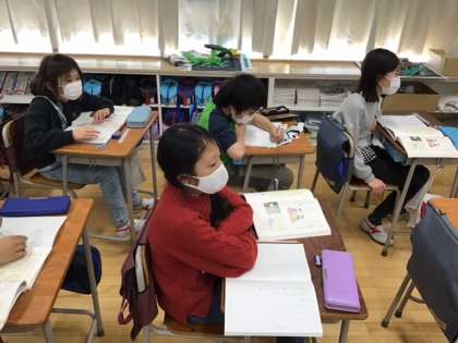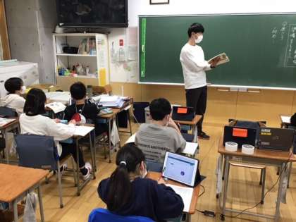 国語の時間です。「調べて話そう」発表のポイントに気をつけながら、発表の準備をしています。