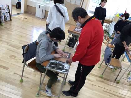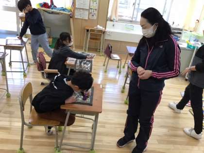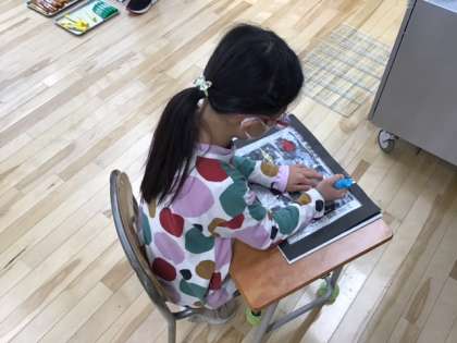図工の時間です。ステンド風作品が完成に近づいてきました。ていねいに色をぬっていますね。