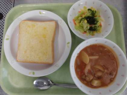 献立 八丈レモントースト、ビーンズシチュー、ブロッコリーサラダ、牛乳