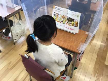 音楽の時間です。「エンターテイナー」いろいろな楽器の音色に気をつけて、合奏を聞いています。