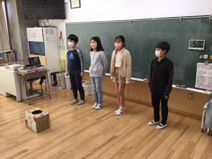 学級活動の時間です。6年生を送る会に向けて、協力して練習を進めています。どんな出し物になるのでしょうか?