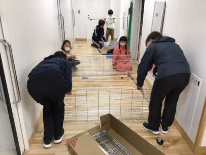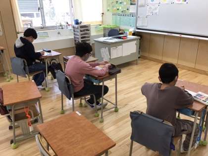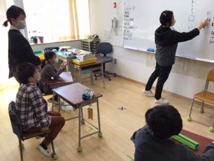 グループ学習の時間です。例文を使って、助詞の学習を進めています。作業に取り組んでいるグループもありますね。
