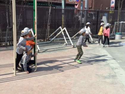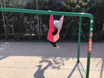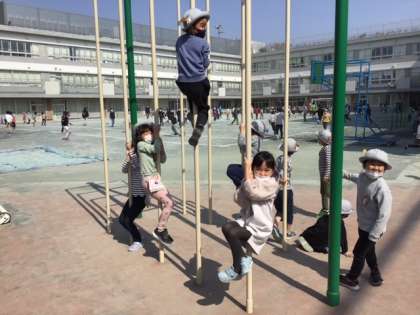 1年生のみなさんが、登り棒やうんてい、おにごっこをして遊んでいます。4月になると、2年生ですね。
