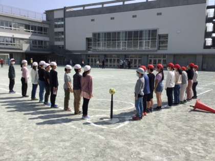 体育の時間です。礼儀正しくあいさつをして、Tボールの試合が始まりました。スイングが速くなり、飛距離が伸びました。