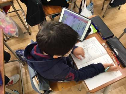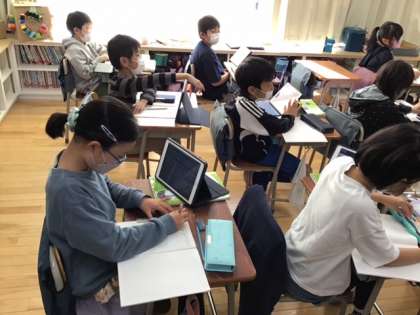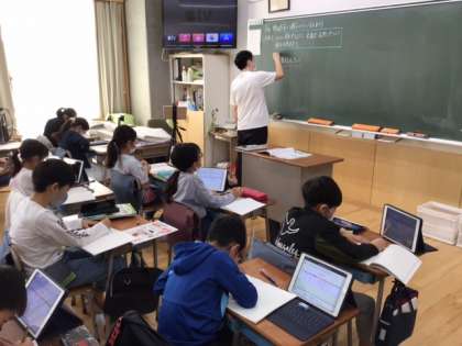 社会科の時間です。人口の変化をもとに、世田谷区の交通や公共施設の様子を考えています。