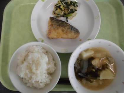 献立 ご飯、さばの揚げ煮、ほうれん草のお浸し、じゃが芋とわかめのみそ汁、牛乳